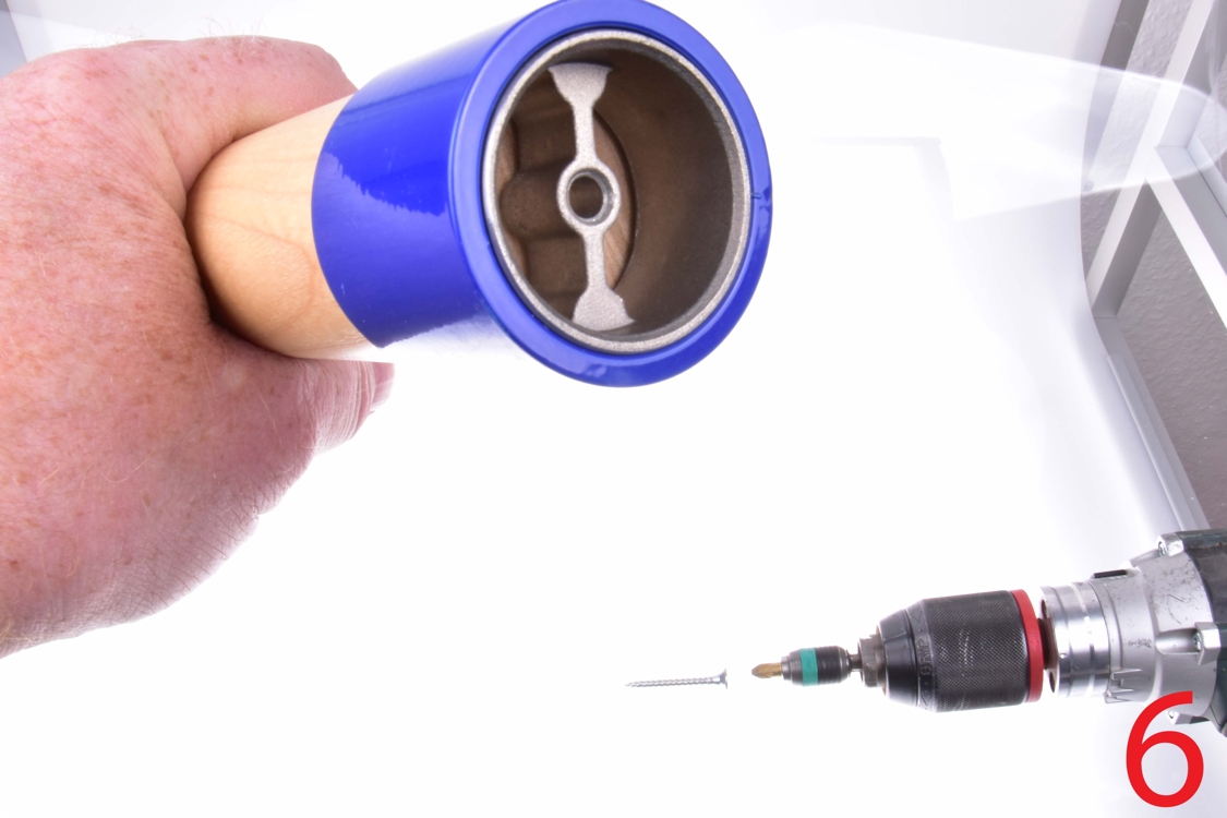 Mit Hilfe eines Akkuschraubers schrauben Sie den Adapter durch die mittlere Bohrung fest. Als Schraube verwenden Sie eine Holzschraube (5x35mm oder 5x40mm) (Bilder 6 + 7).Bei harten Hölzern müssen Sie evtl. vorbohren.